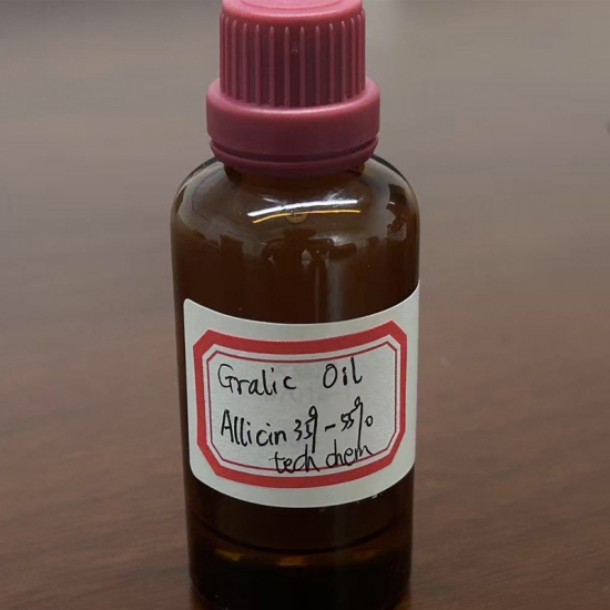 Óleo de alicina alicina 35% ~ 55% CAS NO. 8008-99-9 Um líquido volátil que varia do amarelo-claro ao marrom-avermelhado, com forte odor de alho. É insolúvel em água, glicerina e propilenoglicol, com densidade relativa de 1,050-1,059 e índice de refração de 1,550-1,580. Suas propriedades químicas são relativamente estáveis, mas se decompõe facilmente quando exposto a álcalis. .